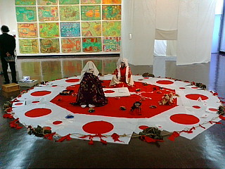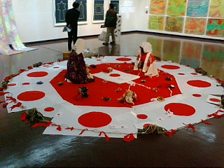 プラステックをあえて使い、その上に樹脂の赤・黒を流しています。やすっぽくて虚無感の方が良い。花ひとつでも高価であってはならない。長崎の精霊流しに使われる造花、西方浄土の舟で使う造花です。人はやがて浄土に行くという意味です。