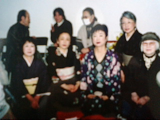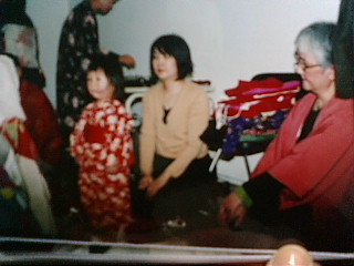 二人の女性が赤ちゃんのお布団の前で正座しています。新しい命を見つめるように。女性はお祖母ちゃんとお母さんでもあり、お母さんとそのお姉さんかもしれません。小さな命を愛おしく見守っています。