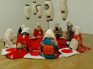 ⑩おにぎりを運ぶ=座布団の後の飯台へ置く=8人分沢庵を添える。(11時30分)