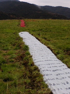 大中尾棚田アートに参加、30mの白い布に書きます。